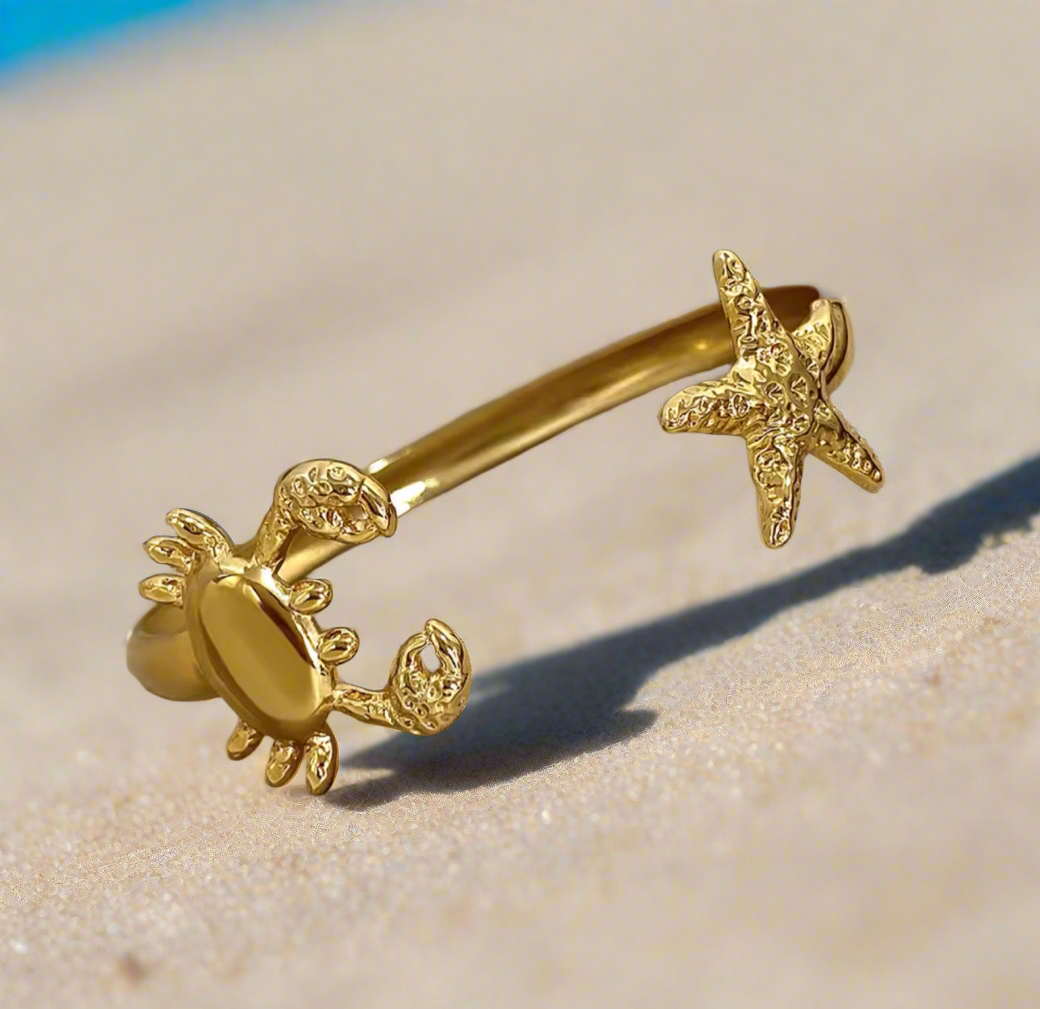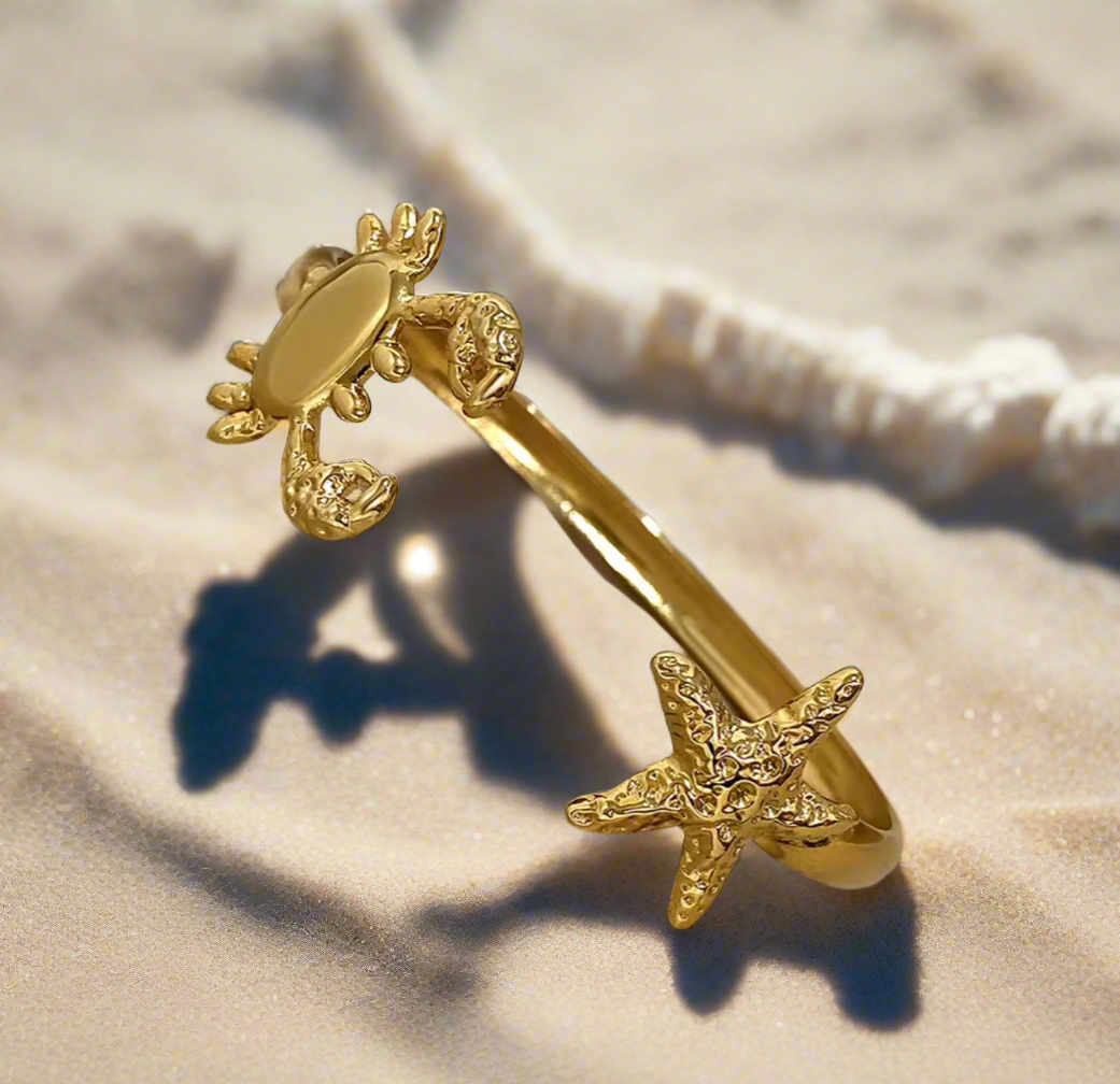 Experience the beauty of the ocean with OCEAN TWIST bangle. Crafted with intricate details of a crab and starfish, this bangle will remind you of the mesmerizing creatures of the sea. Made with quality materials, it is the perfect accessory to elevate any outfit.