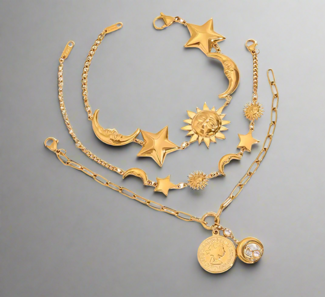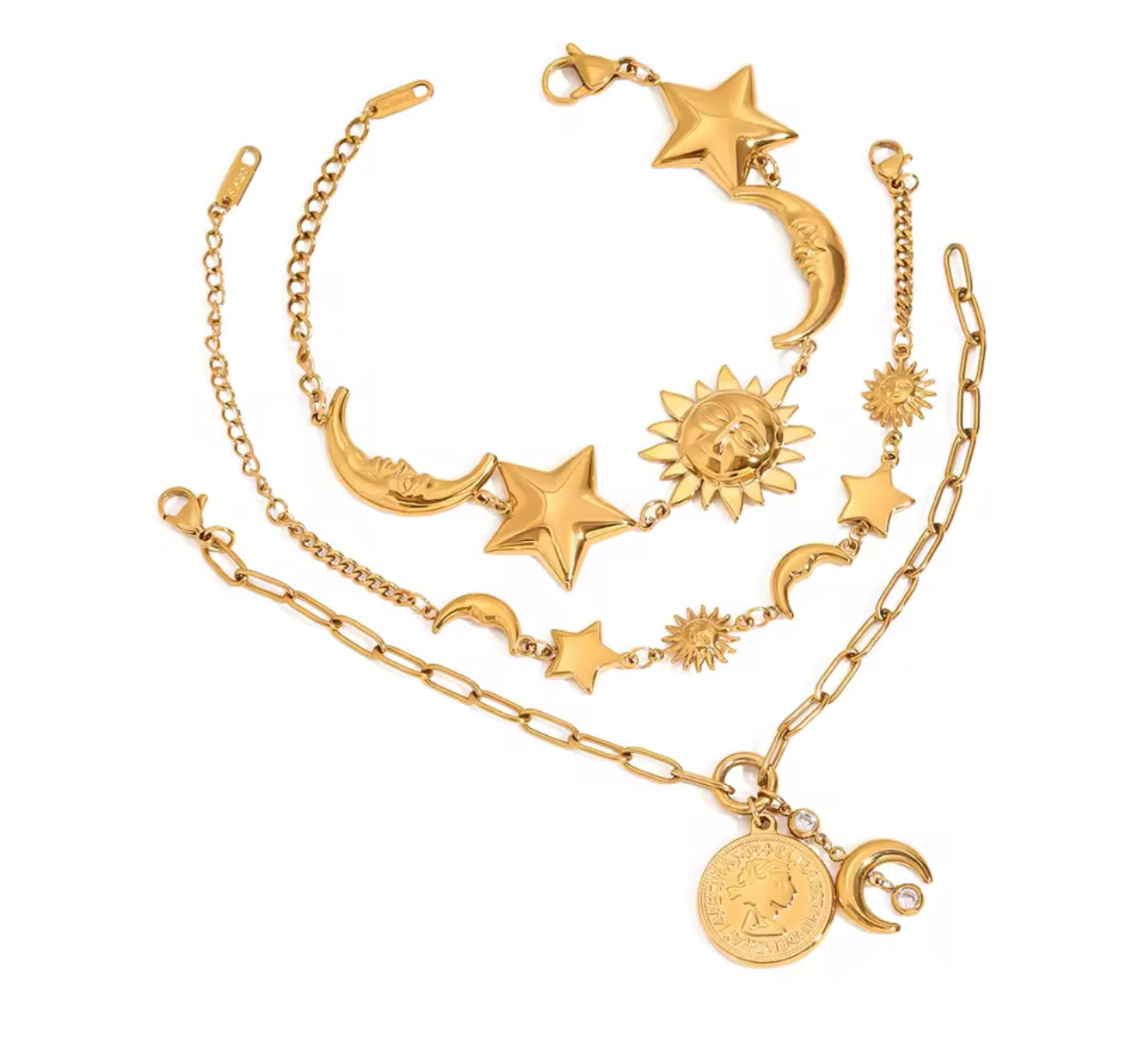 Expertly crafted, our SUNMOONSTAR BRACELETS trio is the perfect combination of style and durability. Made with high-quality stainless steel, these bracelets are built to last and add a touch of elegance to any outfit. Complete your look with this must-have accessory.